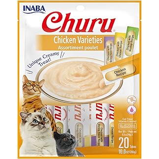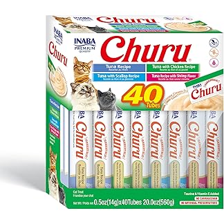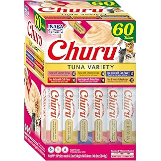 INABA Churu Cat Treats, Grain-Free, Lickable, Squeezable Creamy Purée Cat Treat/Topper with Vitamin E & Taurine, 0.5 Ounces Each Tube, 50 Tubes, Tuna & Chicken Variety$32.96 (as of October 31, 2025 18:14 GMT +03:00 – More info) Add to Cart