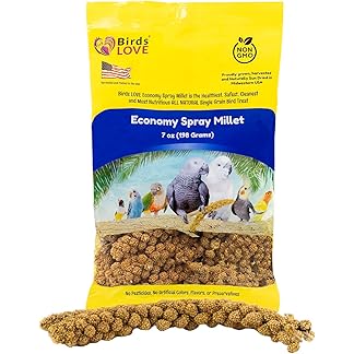 Birds LOVE Economy & Thin Special Spray Millet GMO-Free No Pesticides (No Stems Only Edible Tops) for Birds Cockatiel Lovebird Parakeet Finch Canary All Parrots Healthy Treat-9oz…$12.44 (as of January 4, 2024 10:13 GMT +03:00 – More info) Add to Cart