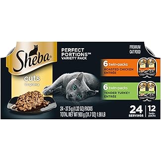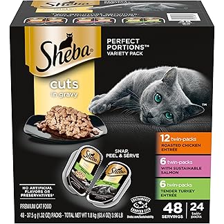 Sheba Perfect Portions Wet Cat Food Cuts in Gravy Variety Pack, Roasted Chicken Entree and Tender Turkey Entree, 2.6 oz. Twin-Pack Trays (12 Count, 24 Servings)$12.57 (as of September 15, 2025 15:42 GMT +03:00 – More info) Add to Cart