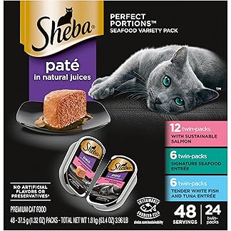 Sheba Perfect Portions Wet Cat Food Pate with Sustainable Salmon, Signature Seafood Entree, and Tender Whitefish and Tuna Entree Variety Pack, 2.6 oz. Twin Pack Trays (24 Count, 48 Servings)$23.38 (as of October 22, 2025 15:12 GMT +03:00 – More info) Add to Cart