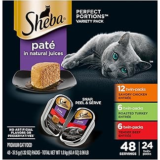 Sheba Perfect Portions Wet Cat Food Pate Savory Chicken Entree, Roasted Turkey Entree, and Tender Beef Entree Variety Pack, 2.6 oz. Twin Pack Trays (24 Count, 48 Servings)$23.38 (as of September 15, 2025 15:42 GMT +03:00 – More info) Add to Cart