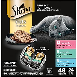 Sheba Perfect Portions Wet Cat Food Cuts in Gravy Variety Pack, Sustainable Salmon, Sustainable Tuna, and Delicate White Fish & Tuna Entree, 2.6 oz., Twin-Pack Trays, (24 Count, 48 Servings)$23.38 (as of April 11, 2025 21:17 GMT +03:00 – More info) Add to Cart
