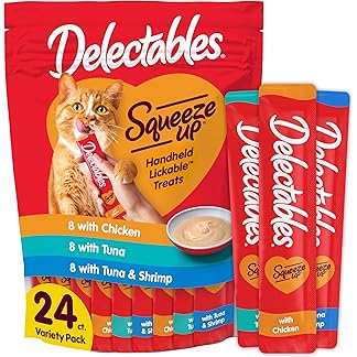 Delectables Squeeze Up Variety Pack, Creamy Squeezable Puree, Lickable Wet Cat Treats, Grain Free, No Added Fillers, No By-Products, No Added Preservatives, 0.5 Ounces Tube, 24 Tubes Total$13.57 (as of October 22, 2025 04:00 GMT +03:00 – More info) Add to Cart